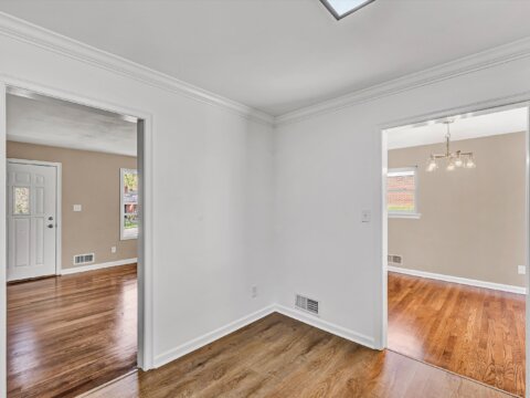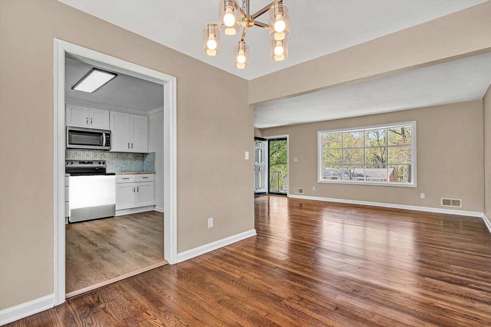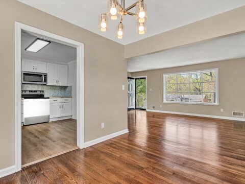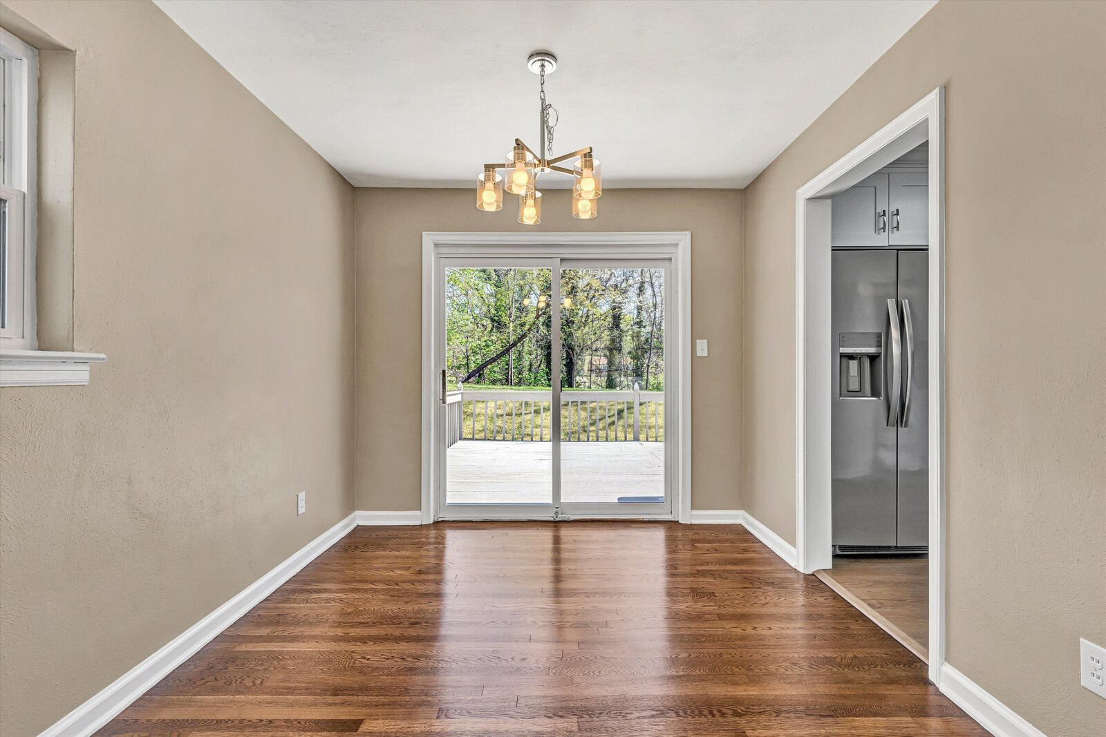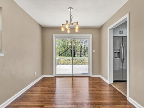 - Dining room with new chandelier, hardwoods, & sliding glass door to back deck