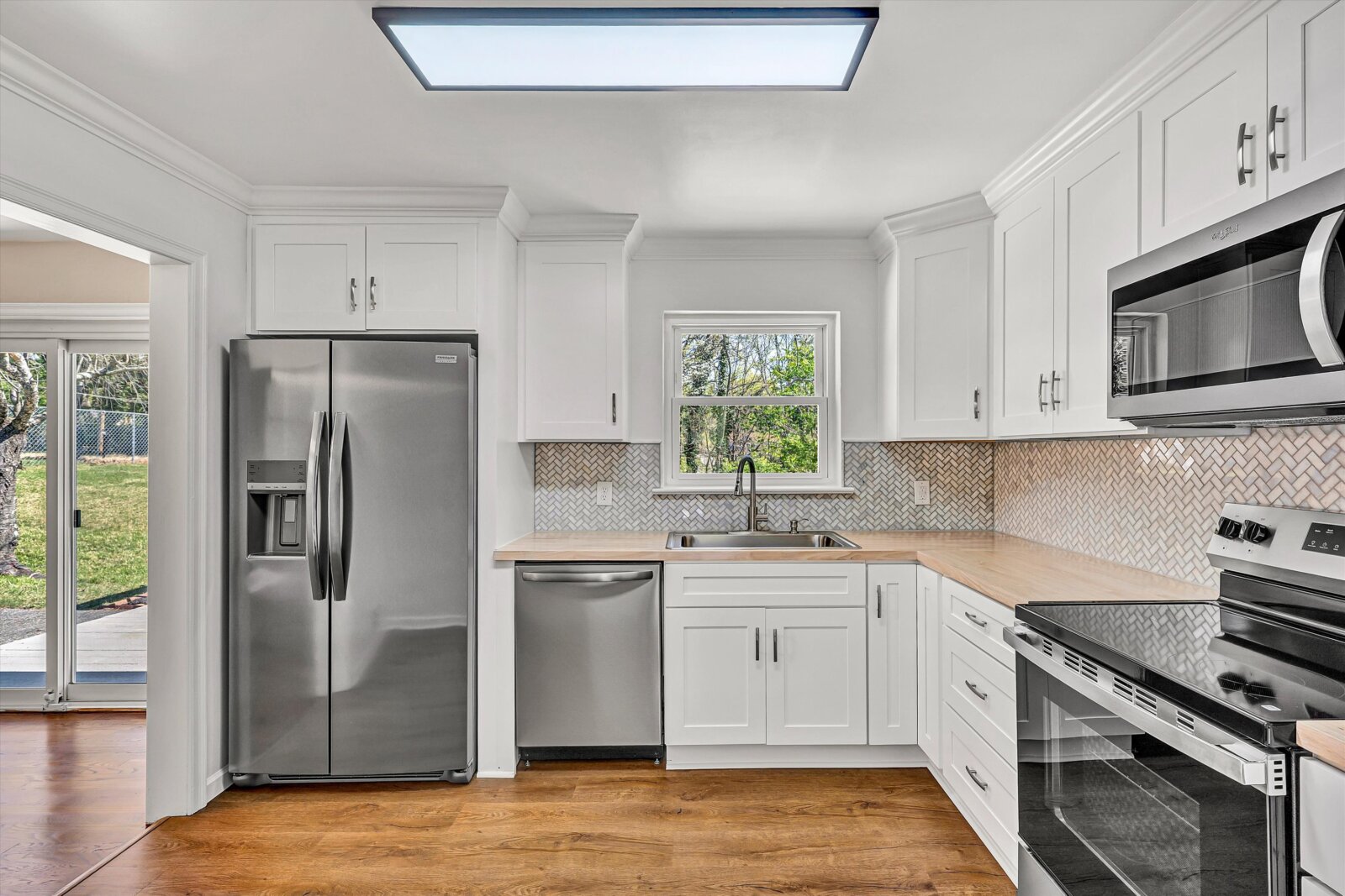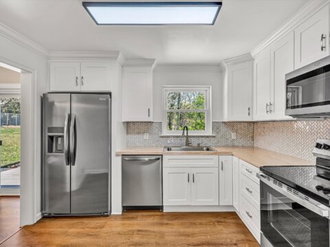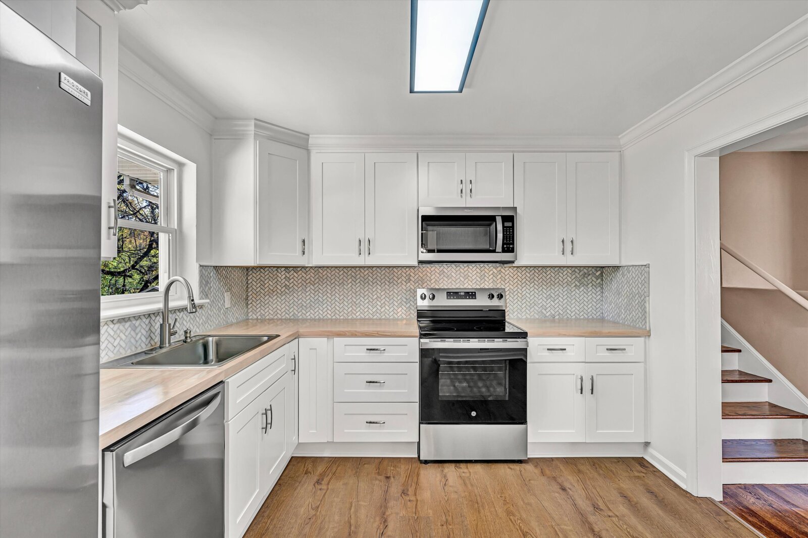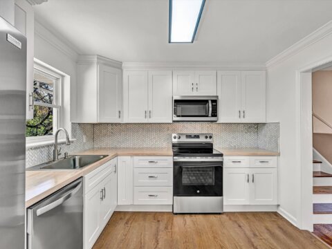 - Kitchen with new appliances, Shaker cabinets, marble backsplash, floors & lighting